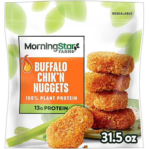 MorningStar Farms Buffalo chik'n nuggets are spicy and buffalo seasoned with a crispy, crunchy breading outside and tender inside. With 30% less fat than regular chicken nuggets*, these plant-based nuggets provide a good source of protein (22% of daily value) and a good source of fiber (contains 10g total fat per serving). Stock this resealable bag in the freezer for an exciting anytime meal starter you can pair with your favorite dips, celery, or serve in a wrap; Whether you're looking for a winning snacking option to share with friends on game night, or just as a part of a quick and convenient lunch or dinner, MorningStar Farms Buffalo chik'n nuggets are a delicious choice sure to please meat-lovers and vegetarians alike. *Chicken nuggets contain 14g total fat per serving (94g). MorningStar Farms Buffalo Chik'n Nuggets contain 10g total fat per serving (94g).