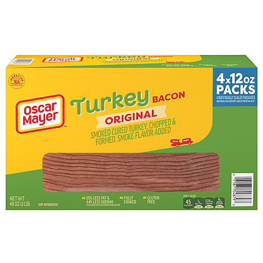 Everything is better with turkey bacon. Oscar Mayer Smoked Cured Turkey, Chopped & Formed, Smoke Flavor Added, has 63% less fat and 57% less sodium than USDA data for pork bacon without sacrificing the flavor you crave. Our fully cooked turkey bacon is raised without hormones as federal regulations prohibit the use of hormones of turkey. Each package of fully cooked turkey bacon minimizes prep time, making it easier to create delicious meals in a hurry. Heat our smoked cured turkey bacon on the stove, in the oven or microwave to your desired crispness. Taste the natural hardwood smoke flavor that makes Oscar Mayer turkey bacon the perfect addition to breakfast sandwiches and BLTs. Enjoy turkey bacon with eggs, try it as a savory salad topping or add some slices to your next turkey burger. Discover the endless possibilities of precooked turkey bacon. Oscar Mayer Smoked Cured Gluten Free Fully Cooked Turkey Bacon is vacuum packed in 4 resealable 12-ounce packages with 71-73 slices total.